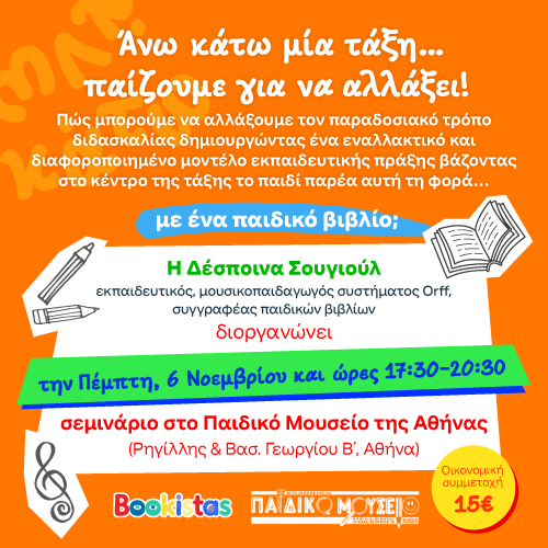 Η Δέσποινα Σουγιούλ, εκπαιδευτικός, μουσικοπαιδαγωγός Συστήματος Orff, συγγραφέας παιδικών βιβλίων διοργανώνει στο Παιδικό Μουσείο της Αθήνας τρίωρο σεμινάριο για εκπαιδευτικούς κάθε ειδικότητας που θέλουν να αξιοποιήσουν το παιδικό βιβλίο ως εκπαιδευτικό και πολιτιστικό εργαλείο για να αλλάξουν την εκπαιδευτική πράξη μέσα από πρακτικά παραδείγματα και δημιουργικές εφαρμογές συνδέοντάς το: