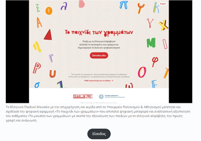 Το Ελληνικό Παιδικό Μουσείο (Ε.Π.Μ.) με χαρά σας ενημερώνει για την ψηφιακή εφαρμογή «Το παιχνίδι των γραμμάτων». Πρόκειται για ψηφιακή μεταφορά και εναλλακτική αξιοποίηση του εκθέματος «Το μουσείο των γραμμάτων» με σκοπό την εξοικείωση των παιδιών με το ελληνικό αλφάβητο, την πρώτη γραφή και ανάγνωση.